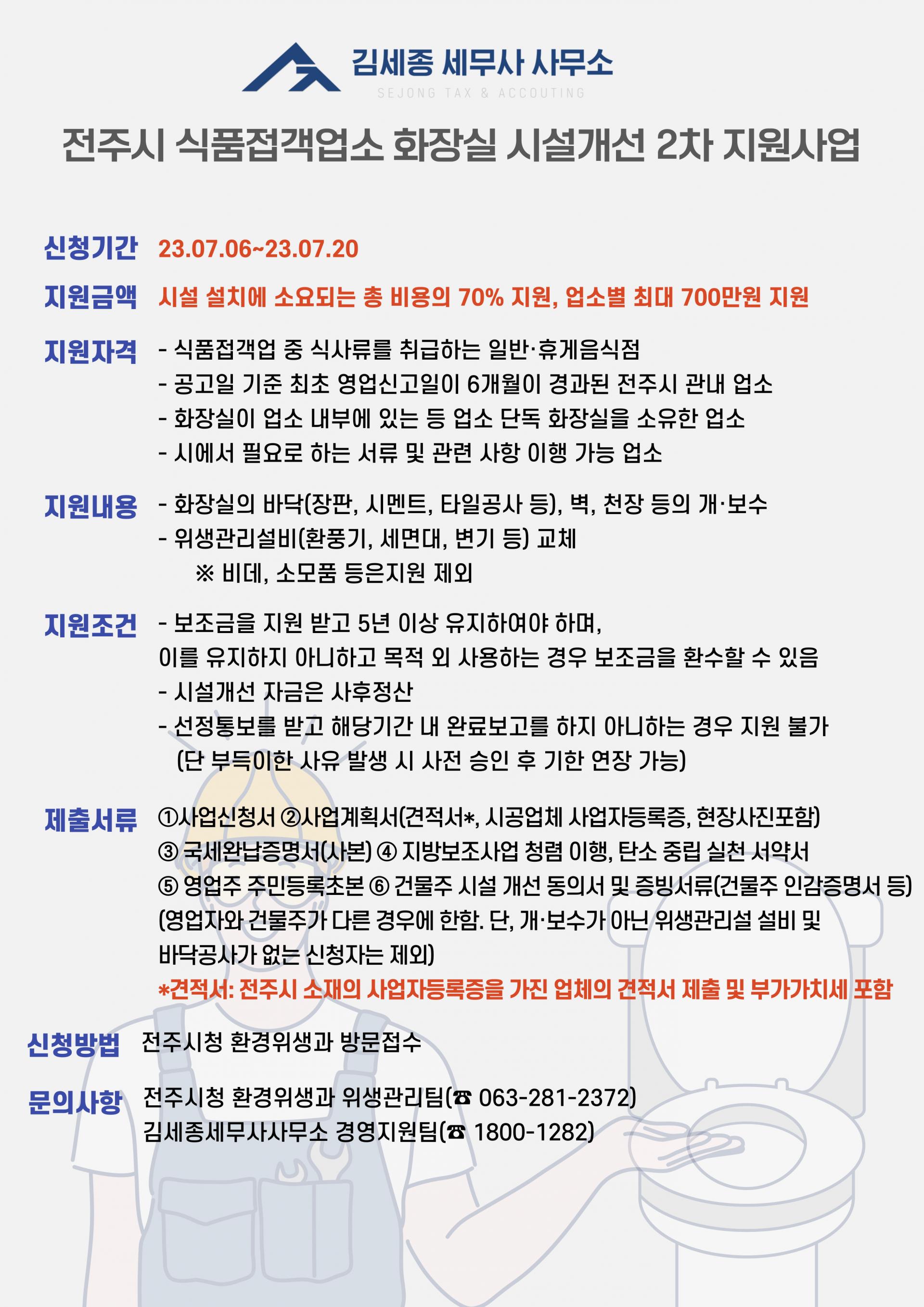 ③ 국세완납증명서(사본) ④ 지방보조사업 청렴 이행, 탄소 중립 실천 서약서 ⑤ 영업주 주민등록초본 ⑥건물주 시설 개선 동의서 및 증빙서류(건물주 인감증명서 등) (영업자와 건물주가 다른 경우에 한함. 단, 개·보수가 아닌 위생관리설 설비 및 바닥공사가 없는 신청자는 제외)